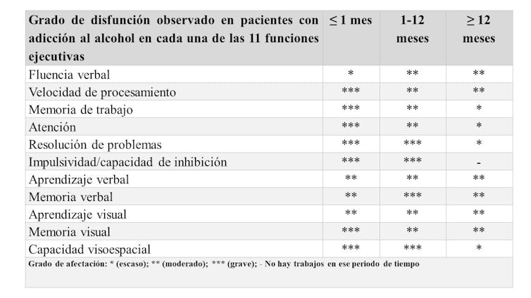 Como puede observarse, la mayoría de las disfunciones encontradas al mes de abstinencia se mantienen durante un año, aunque con menos gravedad. Más allá del año de abstinencia, la gravedad disminuye de forma considerable, lo que implica que una abstinencia superior al año se asocia a la recuperación cognoscitiva y la normalización de las tareas ejecutivas.